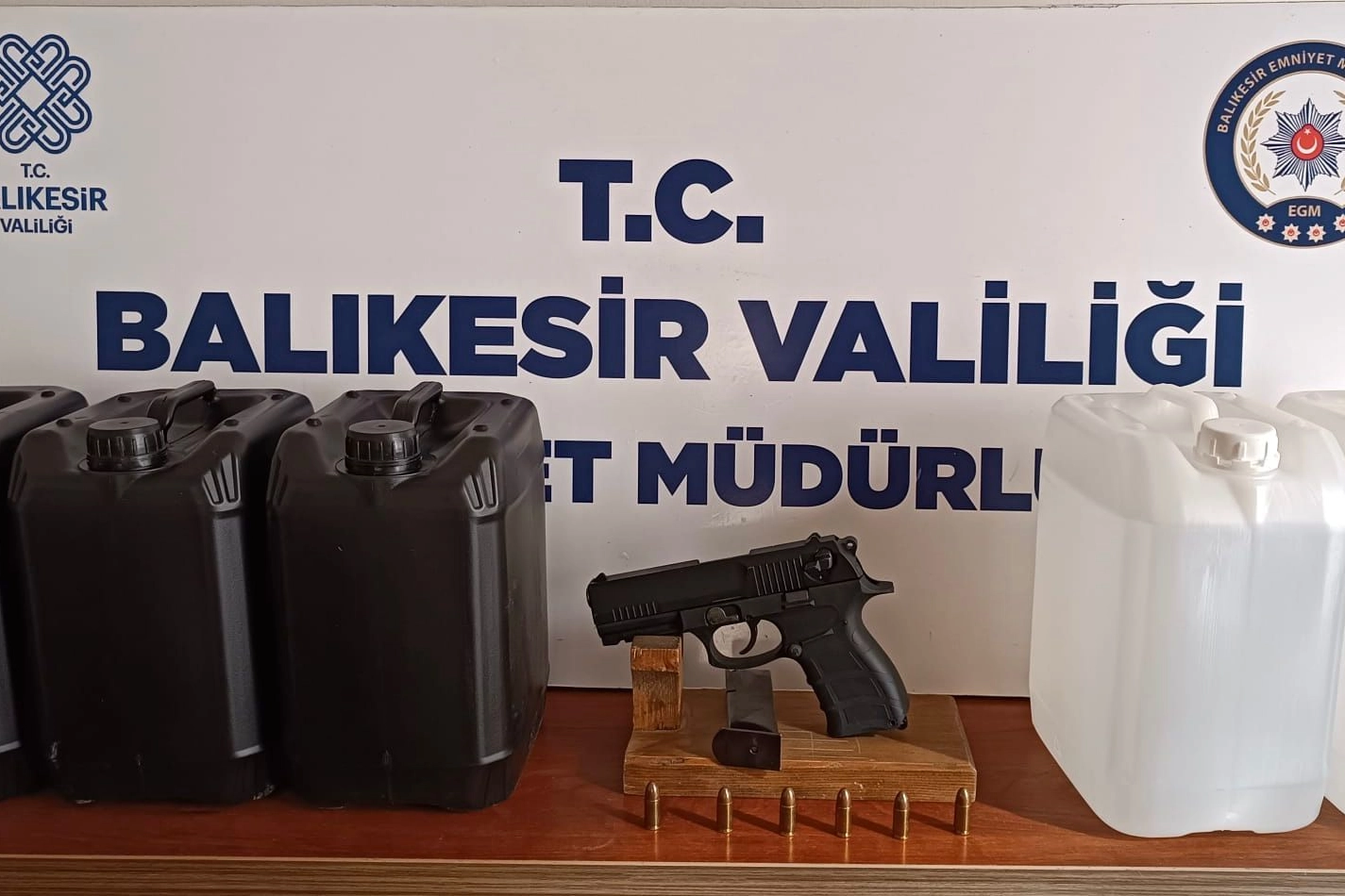 Şahsın kimliğinin T.K. (42) olduğu tespit edildi. Olay yerindeki ilk incelemenin ardından ekipler, şüphelinin ikametinde de arama gerçekleştirdi. Evde yapılan aramalarda, 3’ü siyah renkli ve 2’si beyaz renkli olmak üzere 5 bidon içerisinde toplam 21 litre etil alkol bulundu. Ele geçirilen tabanca ve etil alkole el konuldu.
