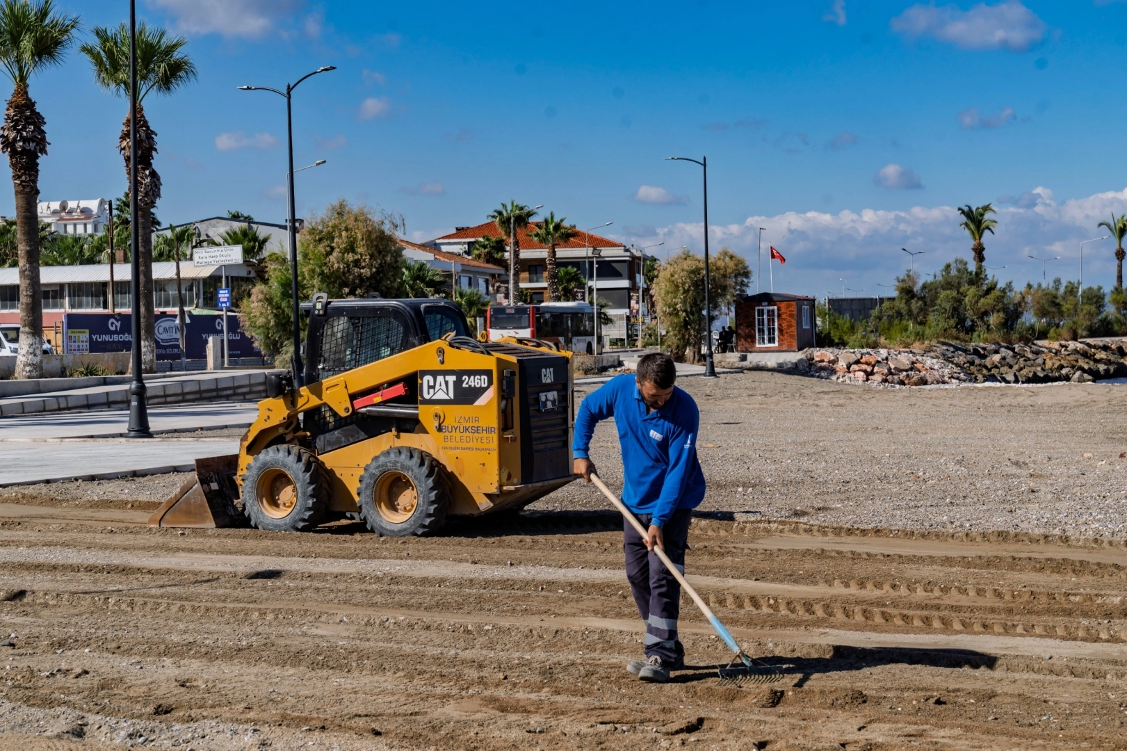 İZMİR (İGFA) - İzmir Büyükşehir Belediyesi'nin İzmirlilerin kentin doğal ve sosyal alanlarından daha fazla faydalanması için kente kazandırdığı sosyal tesislere bir yenisi daha ekleniyor. İzmir Büyükşehir Belediyesi, mülkiyeti kendisinde olan Güzelbahçe Mithatpaşa Caddesi üzerindeki denize sıfır alanı plaj ve sosyal tesise dönüştürmek için çalışmalara başladı. Maltepe Mahallesi’ndeki 2 bin metrekarelik alanda planlanan proje kapsamında ilk olarak alanda eski bir işletmeye ait atıl yapının yıkımı tamamlandı. Alan, İzmirlilerin yaz aylarında keyifle kullanabileceği ve denize girebileceği bir plaj olarak yeniden tasarlandı. Proje kapsamında Fen İşleri Dairesi Başkanlığı ekipleri zemin ve kıyı düzenleme çalışmalarını tamamladı. Yapı İşleri Dairesi ile koordineli olarak yürütülen çalışmalar kapsamında tesisin düzenleme, altyapı ve sert zemin işlemleri yapıldı. Yeni alan engelli erişimine uygun olarak tasarlandı.