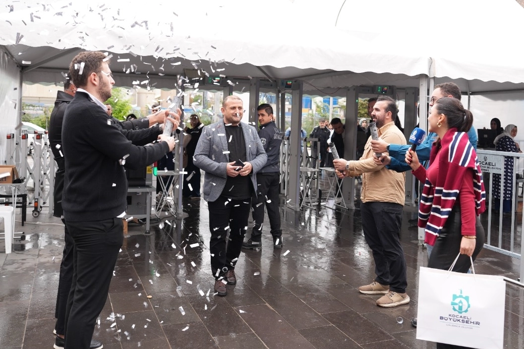 KOCAELİ (İGFA) - Kocaeli Büyükşehir Belediyesi’nin bu yıl “Anadolu Mayası” temasıyla düzenlediği Uluslararası 15. Kocaeli Kitap Fuarı son gününde de yoğun bir ilgi görüyor. Yağışlı havanın da engel olmadığı kitap tutkusuyla dopdolu geçen Kocaeli Kitap Fuarı, 1 milyonuncu ziyaretçisini öğle saatlerinde ağırladı. Bu kapsamda fuarın 1 milyonuncu ziyaretçi Fuat Uçan oldu. Kocaeli Kongre Merkezi’nin üst yol gişelerinden fuar alanına giriş yapan Fuat Uçan, fuarın 1 milyonuncu ziyaretçisi olduğunu sürpriz bir şekilde öğrendi.