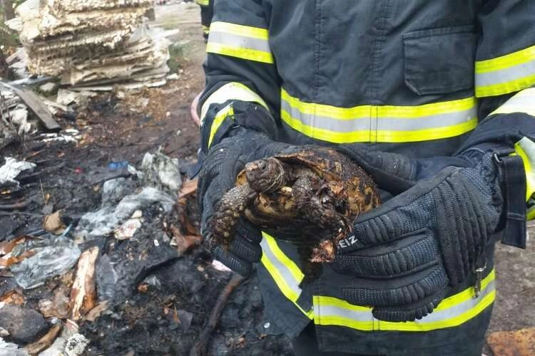 Söndürme sırasında bir itfaiye personeli kaplumbağanın alevlerin arasında kaldığını fark etti.