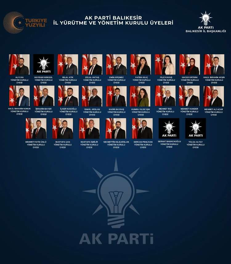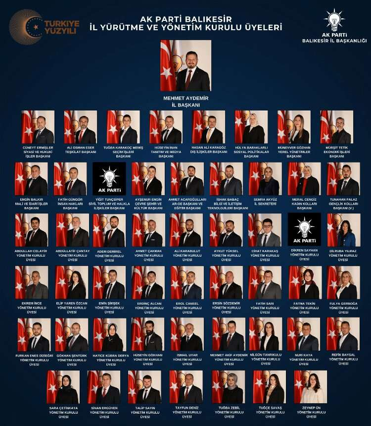 AK Parti Balıkesir İl Başkanlığı, 2024 seçimleri için yeni yönetim kadrosunu açıkladı. Belirlenen ekip, şehri Türkiye Yüzyılına taşıma ve Balıkesir'de rekorlar kırmayı hedefliyor. Açıklanan kadro, önceki dönemdeki katkılarından dolayı tüm gönül dostlarına teşekkür ederek, şehir ve teşkilat için hayırlı olması temennisinde bulunuyor.
