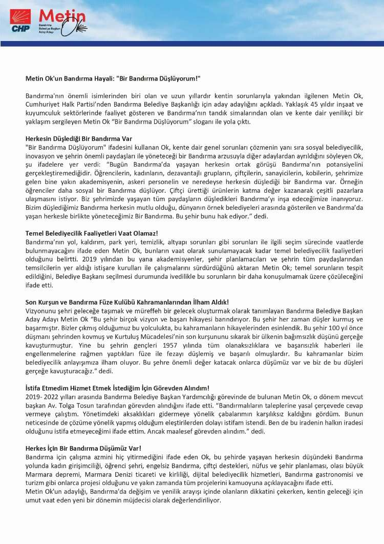 Bandırma'da Yeni Bir Vizyon Metin Ok'un Başkanlık Aday Adaylığı